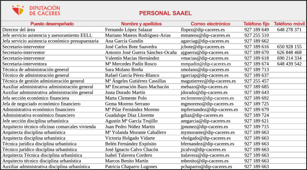 Se consigna aquí el directorio de personal que presta servicios de asistencia y asesoramiento a las entidades locales de la provincia de Cáceres.